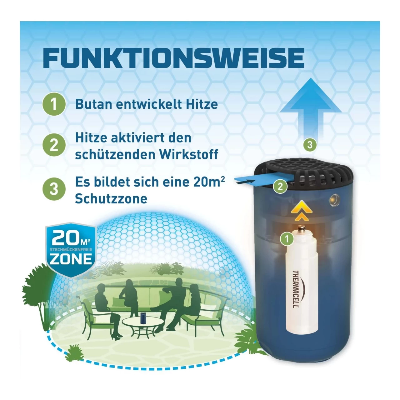 Mückenschutz in modernem Design: Das Thermacell HALO Mini macht auf jedem Campingtisch auch optisch einen guten Eindruck. Die Thermacell-Technologie bietet einen effektiven Schutzbereich von etwa 20 Quadratmetern, der bis zu 98% Stechmücken und ähnliche blutsaugenden Insekten fernhält. Für die Mückenbekämpfung werden Wirkstoffplättchen, die mit einem Mini-Butangasgrill mit Piezozündung (keine offene Flamme) erhitzt werden und einen der Natur nachempfundenen Abwehrstoff abgeben, verwendet. Das HALO Mini ist kinderleicht zu bedienen und sicher im Betrieb. Da die Abwehrstoffe nahezu geruchlos sind, ist Thermacell die ideale Alternative zu Lotionen und Sprays, die auf die Haut aufgetragen werden. Eine Erstausstattung an Verbrauchsmaterial (Butangaspatrone und 3 Wirkstoffplättchen) für 12 Einsatzstunden gehört zum Lieferumfang.