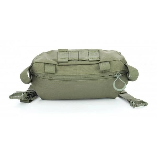 Auf der Rückseite befinden sich an der Nahtlinie des Deckels zwei weitere kleine Schlaufen. Sie dienen der Aufnahme des optional erhältlichen Klettadapters (LINK). Mit Hilfe des Klettadapters wird die Hüfttasche modular an den Plattenträger unserer bekannten Vulcan-Serie befestigt. Außerdem ist auf der Rückseite der Tasche ein Reißverschlussfach vorhanden. In diesem Reißverschlussfach kann die ballistische Einlage (LINK) eingeschoben werden, oder andere flache Gegenstände lassen sich hier verstauen.